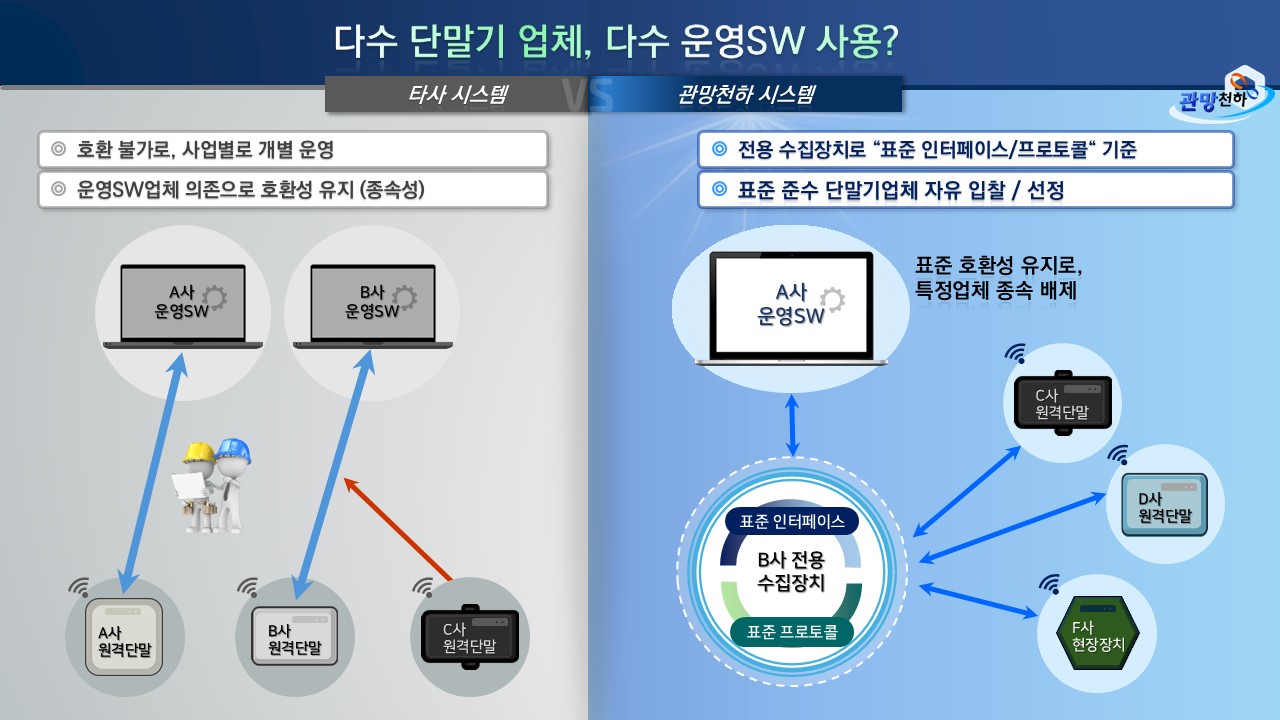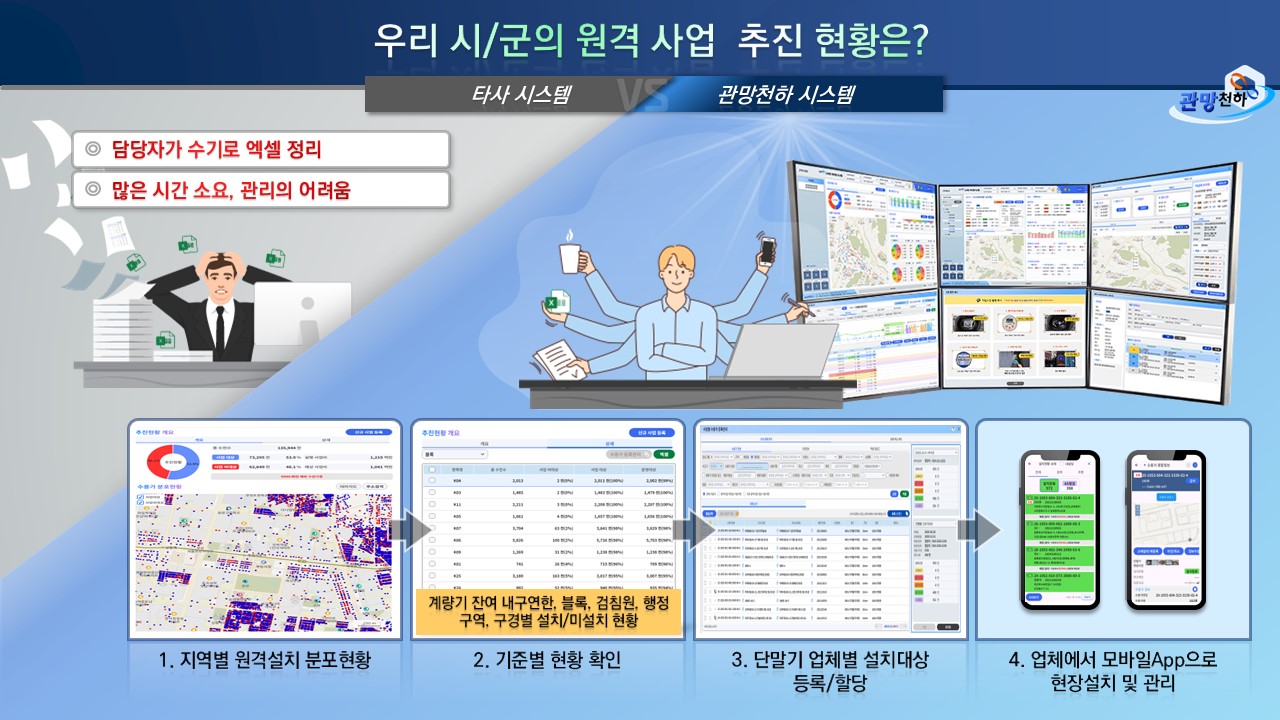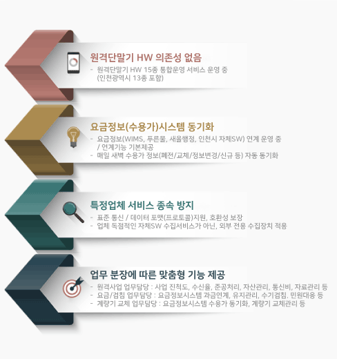 스마트 미터링 시스템은 IoT통신기술 발전으로 지속적인 확장이 이루어 지고 있으며, 검침 수신율 및 제품 신뢰도 향상으로 원격검침 사업의 활성화에 기여 하고 있습니다. 또한, 통합 물 관리의 효율성 극대화를 위한 다양한 연계운영 및 업무활용 기능을 제공하고 있습니다. 효율적인 관리를 위해, 엑셀 등의 수작업 없이 사업관리와 원격단말기 자산관리, 통신단가 및 월별 통신비 분석, 폐기(불용/분실) 단말에 대한 통신 해지관리를 지원하며, 계량기 교체설치와 폐전 처리 업무를 통합관리 할 수 있습니다.