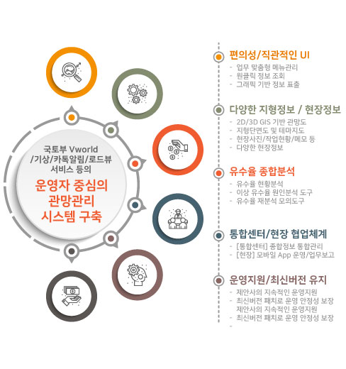 유량데이터에 대한 감시/분석을 기반으로, 통합상황실과 현장, 기술지원과의 협업체계를 통한 유지관리 정보의 통합관리 기능을 제공합니다.