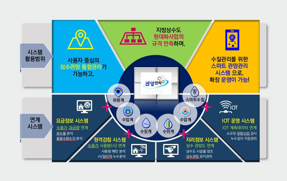 다양한 운영시스템과의 연계운영이 가능하며, “지방상수도 현대화사업” 및 “스마트 관망관리사업”을 위한 통합시스템으로 운영된다.