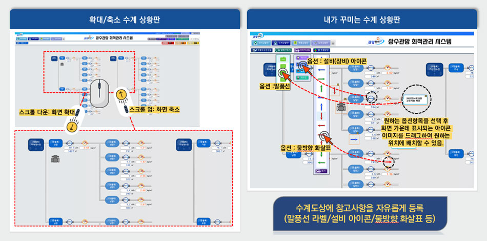 복잡한 수도계통도를 자유롭게 구성하여, 확대/축소로 가독성이 좋으며,주요작업, 업무 참고사항 등을 등록하여 업무 편의성이 증가합니다.